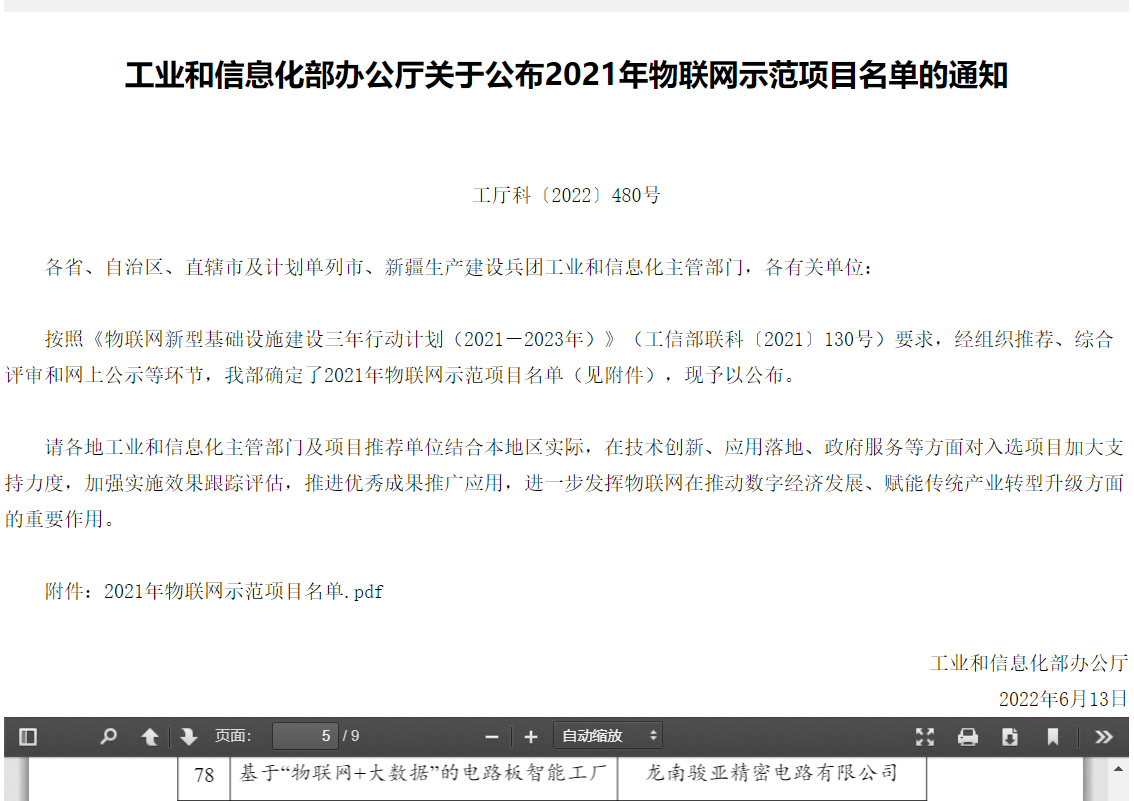 近日,国家工业和信息化部网站发布了“2021年物联网示范项目”公示名单,龙南918.COM精密电路有限公司“基于‘物联网+大数据’的电路板智能工厂”项目入选融合应用创新类项目。